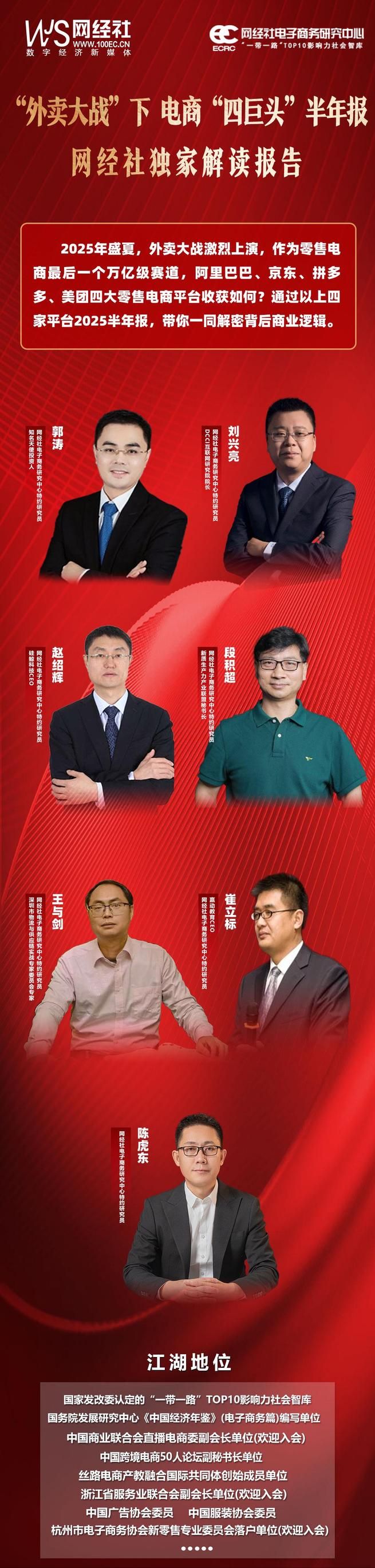 网经社深耕数字经济行业18年,长期关注数字零售,旗下数字零售台重点报道、研究与服务的公司有(1)综合电商:阿里巴巴、京东、淘宝、天猫、拼多多、苏宁易购、唯品会、得物等;(2)直播电商:抖音、快手、视频号、淘宝直播、京东直播、多多直播、蘑菇街直播、唯品会直播、小红书直播等;(3)生鲜电商:本来生活、京东到家、美团闪购、淘宝买菜、多点、叮咚买菜、朴朴超市、美团买菜、盒马鲜生、多多买菜、美团优选等;(4)社交电商:识货、芬香、花生日记、粉象生活、梦饷集团等;(5)二手电商:闲鱼、转转、找靓机、爱回收、红布林等;(6)美妆电商:聚美优品、逸仙电商、亲亲网等;(7)酒水电商:i茅台、酒仙网、1919酒类直供、酒便利、也买酒、中酒网、酒廷1990等;(8)宠物电商:波奇网、E宠商城、宠物家、疯狂的小狗等;(9)电商服务商:微盟、有赞、微店、光云科技、壹网壹创、丽人丽妆、宝尊电商、店宝宝、若羽臣等;(11)母婴电商:宝贝格子、宝宝树、妈妈帮、亲宝宝等;(12)汽车电商:京东养车、天猫养车、途虎养车、瓜子二手车、人人车、好车无忧、优信、卖好车等;(13)奢侈品电商:寺库、包大师、唯礼网、识季、爆爆奢、妃鱼等;(14)鲜花电商:花加、花礼网、买花网、花点时间等;(15)私域电商:快团团、鲸灵集团、好衣库、群接龙、团团团等。