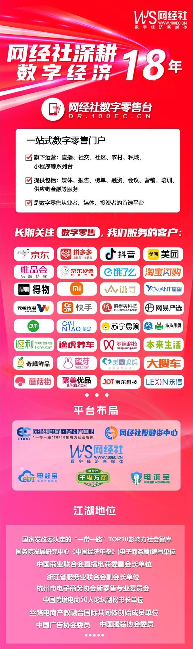 网经社数字零售台是一站式数字零售门户,旗下运营:直播、社交、社区团购、农村、生鲜、汽车、二手、母婴等系列频道,提供包括:媒体、报告榜单、融资、会议、营销、培训、供应链融资等。