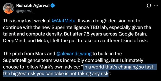 另一位MSL研究员Rishabh Agarwal也被小扎的毒鸡汤「劝退了」,官宣离职: